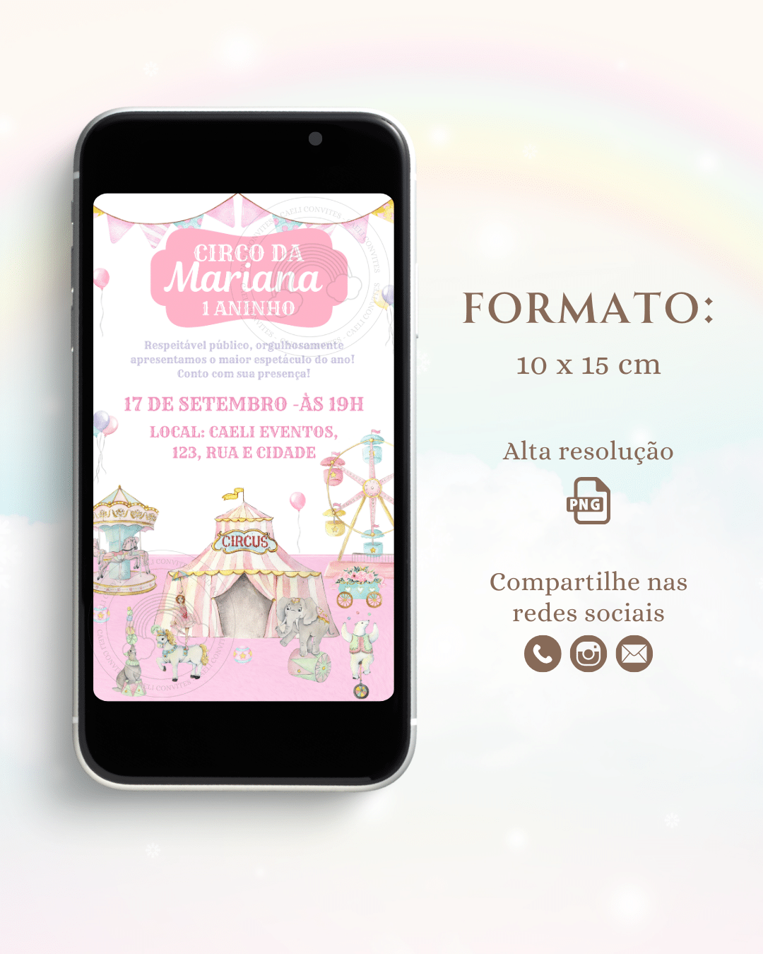 O convite personalizado será enviado para o seu WhatsApp ou e-mail informado na compra em até 2 dias úteis. Ele é exclusivamente digital e por isso não possui frete para entrega.