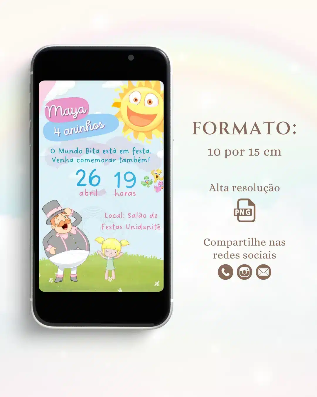 Você receberá um arquivo digital no formato PNG nas dimensões de 10×15 cm, personalizado de acordo com o modelo escolhido.