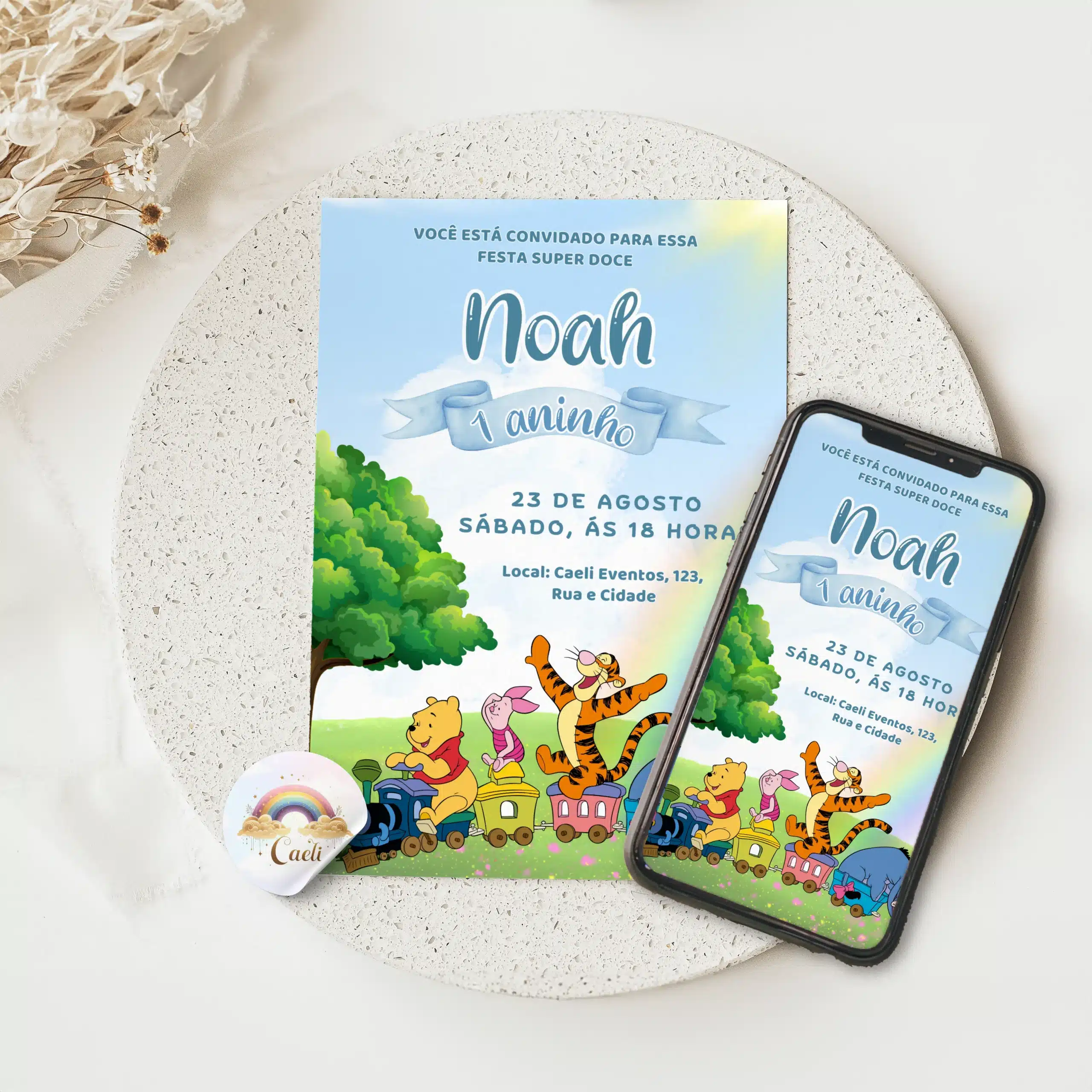 Você receberá um arquivo digital no formato PNG nas dimensões de 10 cm×15 cm, personalizado de acordo com o modelo escolhido: Convite Digital Ursinho Pooh 1.
