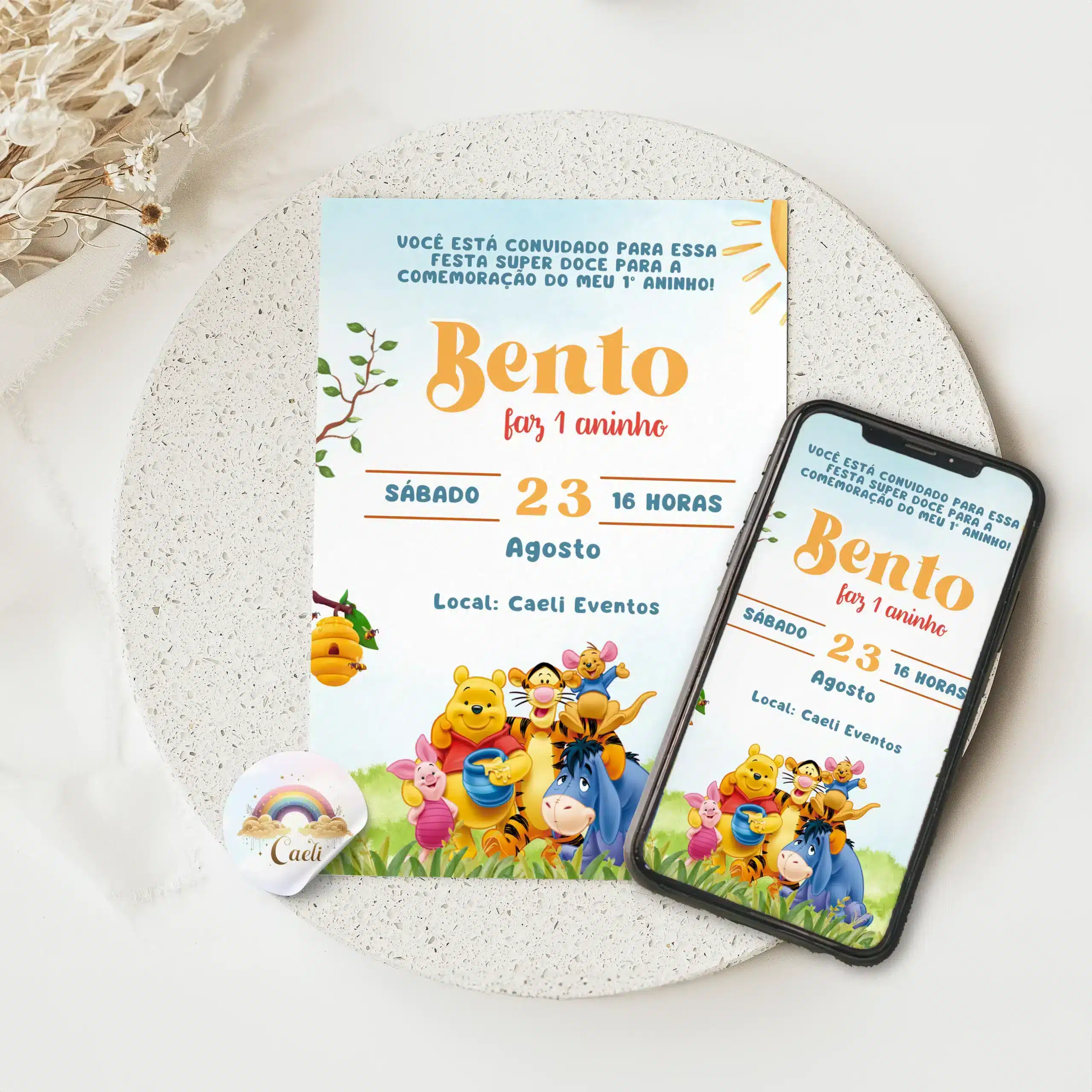 Você receberá um arquivo digital no formato PNG nas dimensões de 10 cm×15 cm, personalizado de acordo com o modelo escolhido: Convite Digital Ursinho Pooh 2.