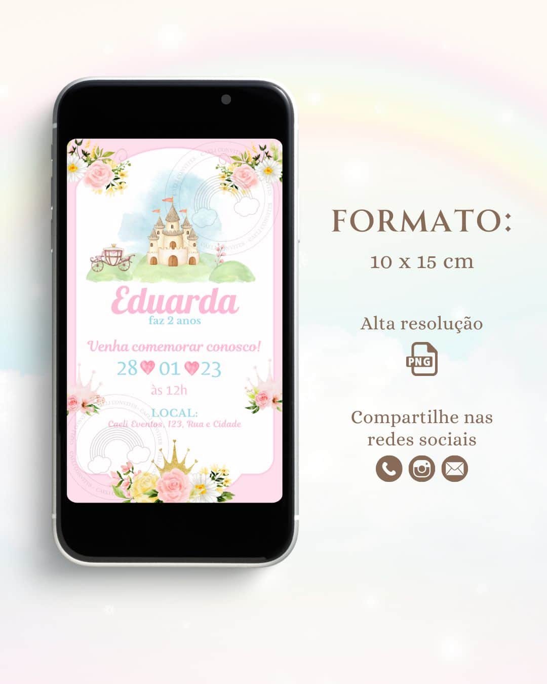 O convite é digital, você receberá o convite exatamente igual ao modelo ao lado. O formato do convite está descrito na imagem (PNG, PDF, URL ou MP4). O prazo de envio é até 2 dias úteis. As informações serão solicitadas após confirmação de pagamento. ATENÇÃO: Alterações posteriores serão feitas mediante taxa adicional.